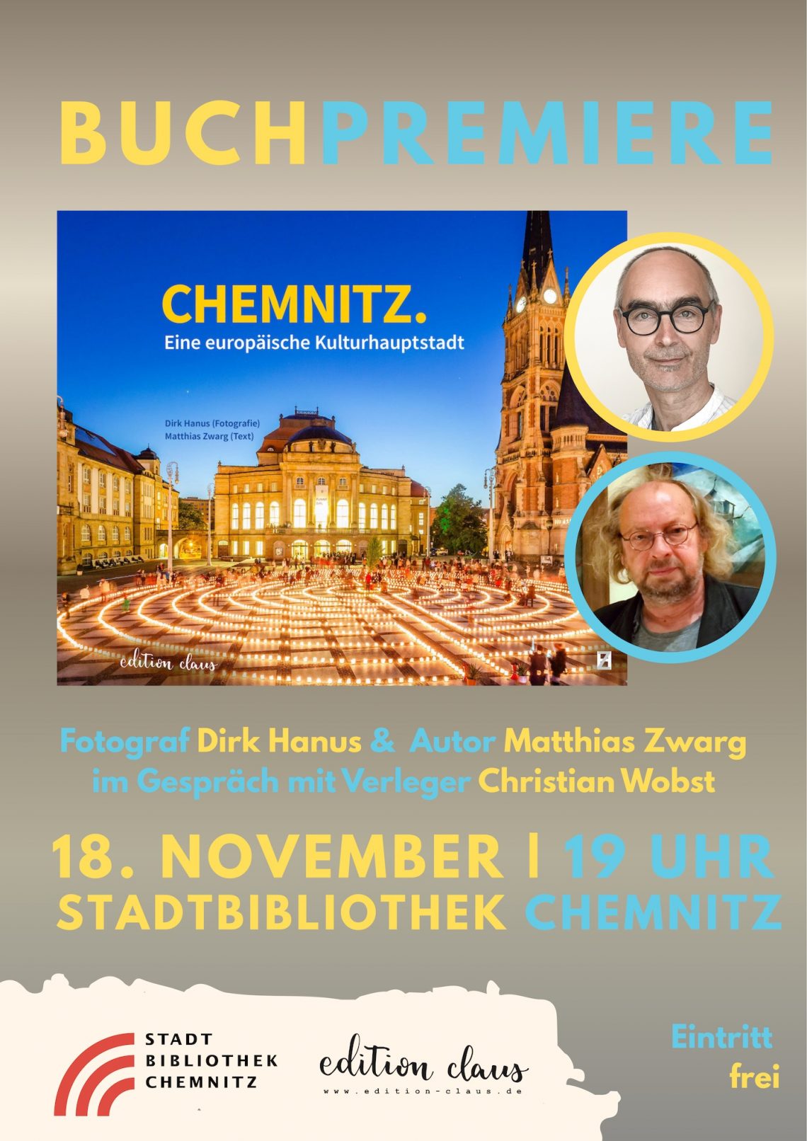 Der Chemnitzer Fotograf Dirk Hanus und der Autor Matthias Zwarg stellen im Gespräch mit Verleger Christian Wobst am Dienstag, den 18. November ihre Neuerscheinung „Chemnitz. Eine europäische Kulturhauptstadt“ vor. Die Veranstaltung in der Stadtbibliothek Chemnitz beginnt 19 Uhr. Der Eintritt ist frei.